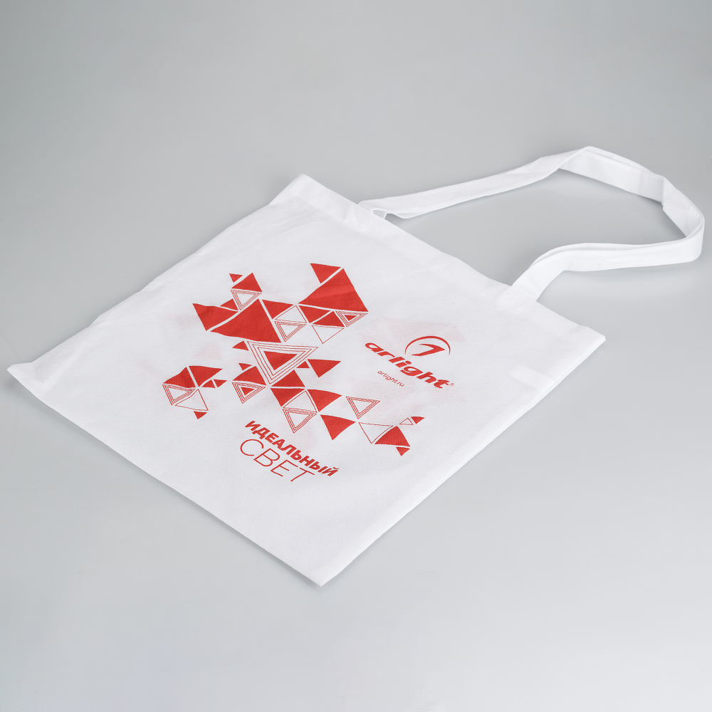 Сумка белая 38*38см, длинные ручки 29см. Персонализация: двухстороннее нанесение, русский+английский (логотип arlight, фирменный элемент "а", сайт www.arlight.ru). Материал - нетканый полипропилен. Для грузов до 10кг.